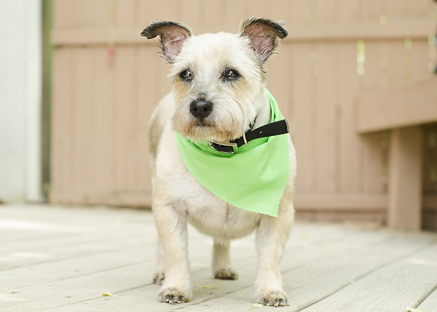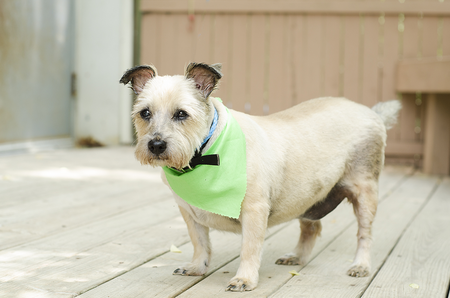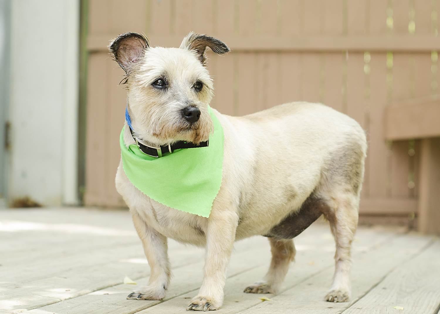 The small terrier mix had a greasy, matted coat, infections in both ears, substantial hair loss on both flanks, and a tumor on the inside of his rear leg. Despite all of these issues that suggested years of neglect, this little guy had been previously neutered, so we're assuming he had been loved and well cared for at some point in his life.