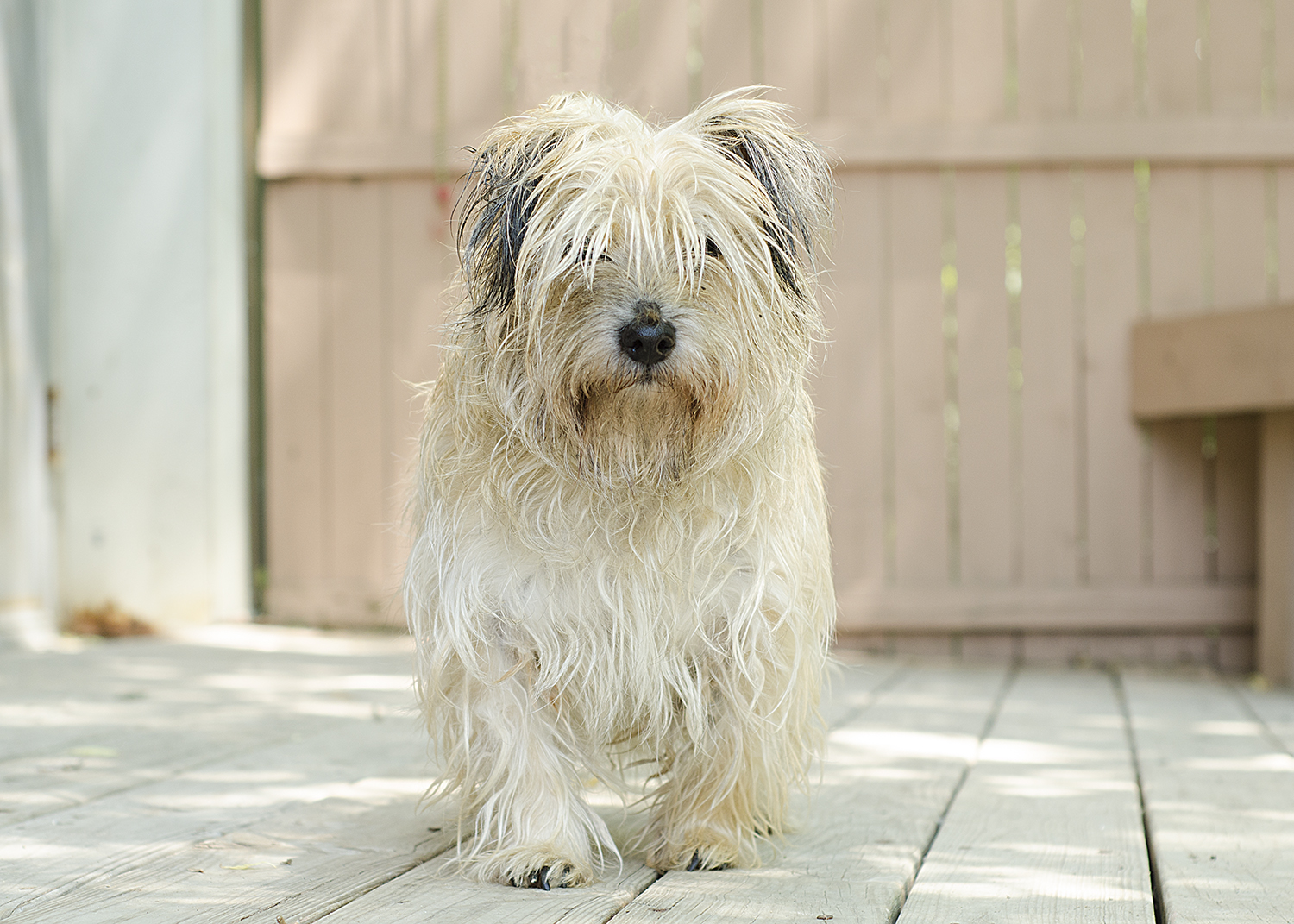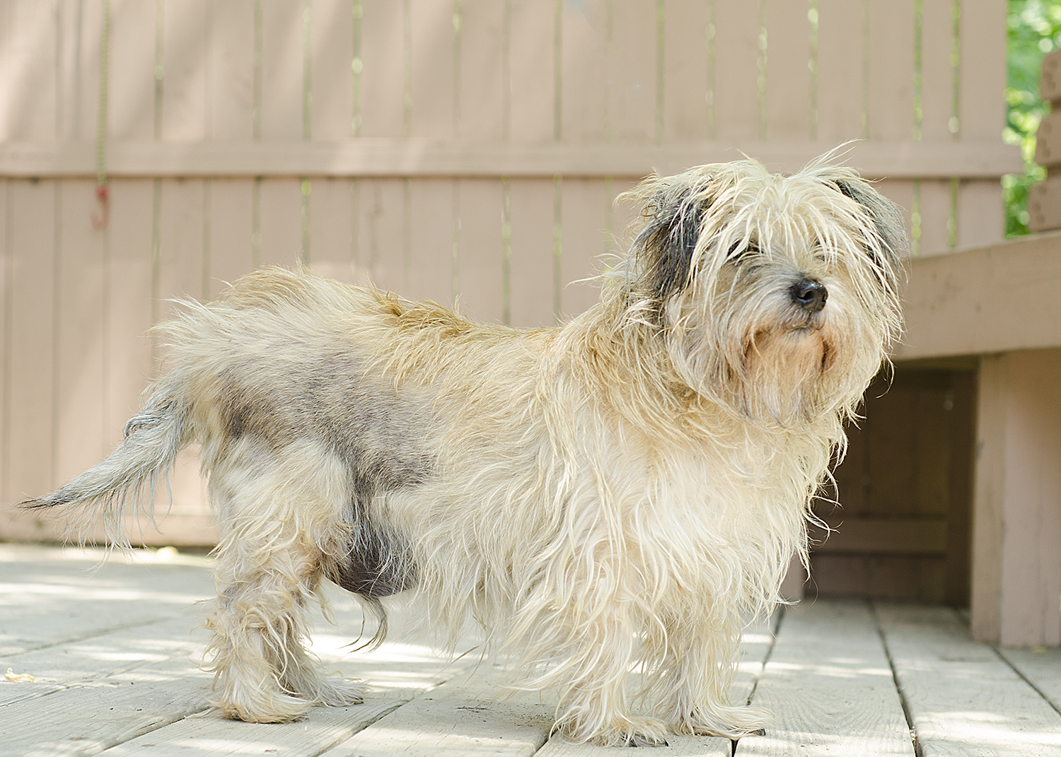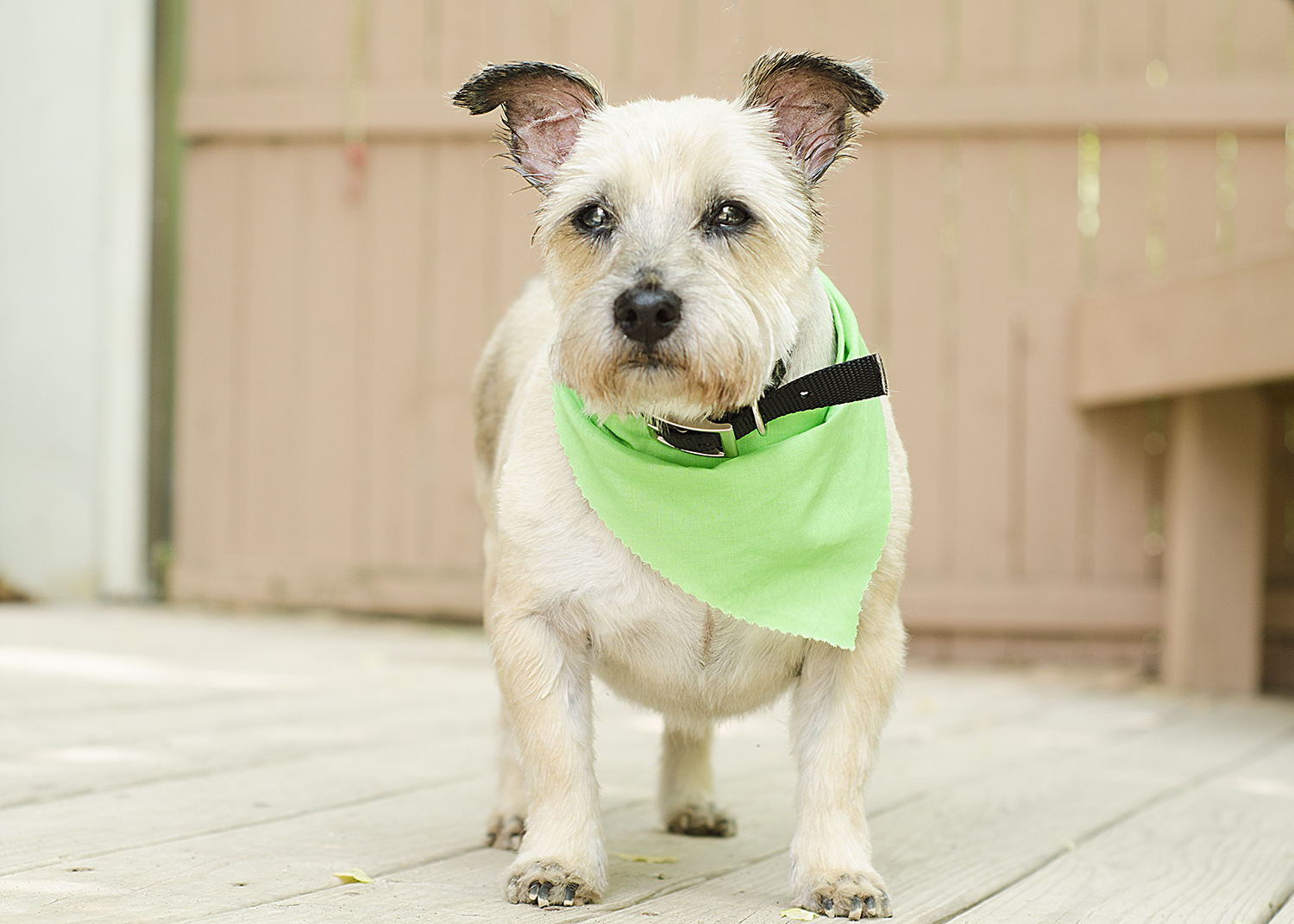 The small terrier mix had a greasy, matted coat, infections in both ears, substantial hair loss on both flanks, and a tumor on the inside of his rear leg. Despite all of these issues that suggested years of neglect, this little guy had been previously neutered, so we're assuming he had been loved and well cared for at some point in his life.