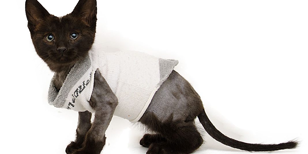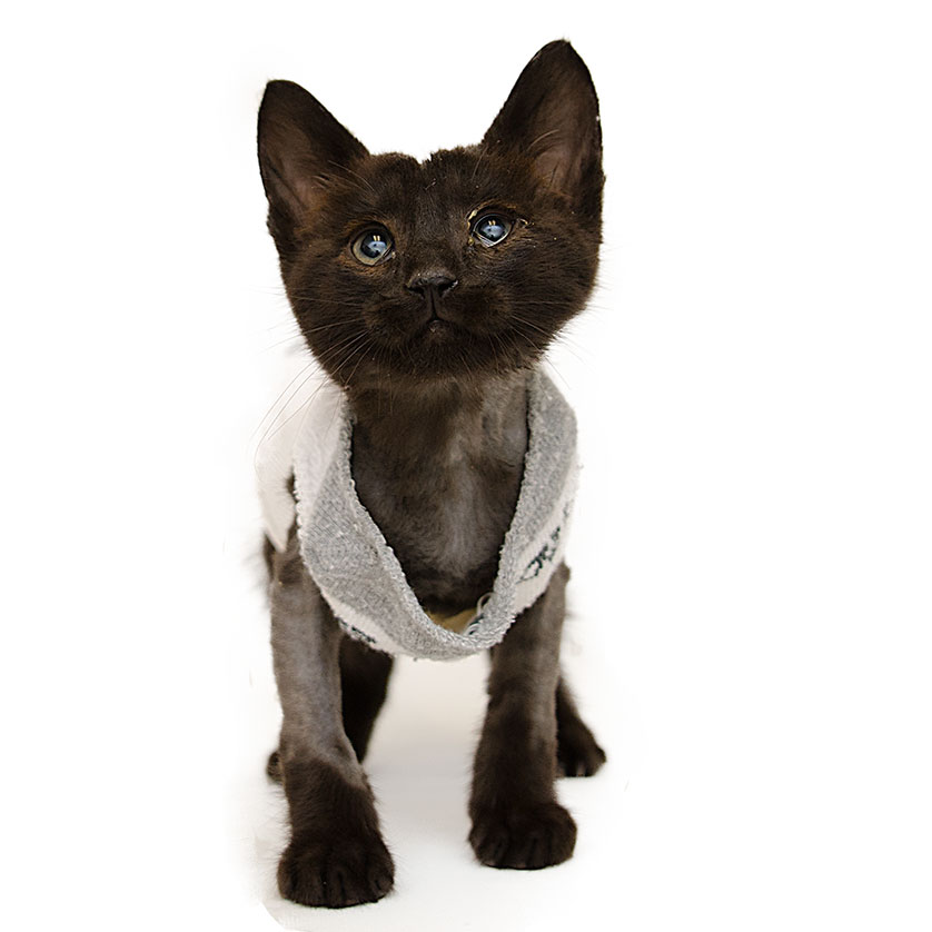 The kitten's coat required a complete shave in order to remove the botfly larvae. Once shaved, he was scrubbed clean and given parasite preventative to help control any remaining parasites. Once naked though, the little guy couldn't stop shivering. Our Hope Clinic team quickly fashioned a "kitten sweater" for him out of a sock – which he loves!