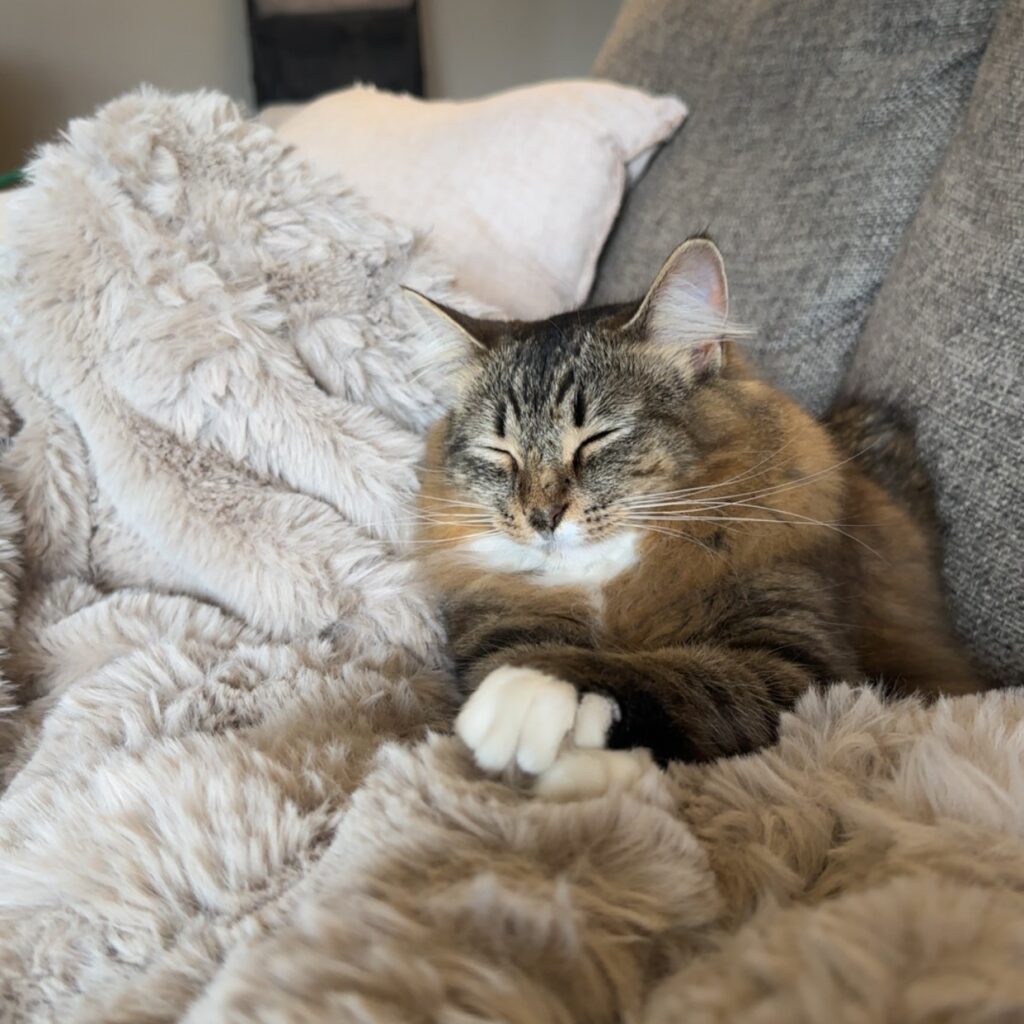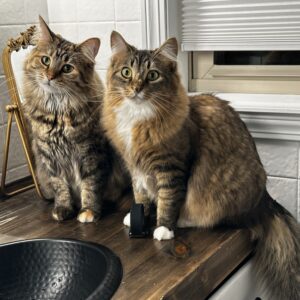 “Aziza, now just Ziza, is the most lovable, furriest, happiest kitty I’ve ever met! We were so happy to bring her home last June! She constantly reminds us how happy she is by following us room to room, laying on our laps, and sleeping with us in our bed. She is the sweetest thing and has become BFFs with her sister, Roxi! They are both airport TSA when we bring groceries home, which is much appreciated, & they love to nap together.”