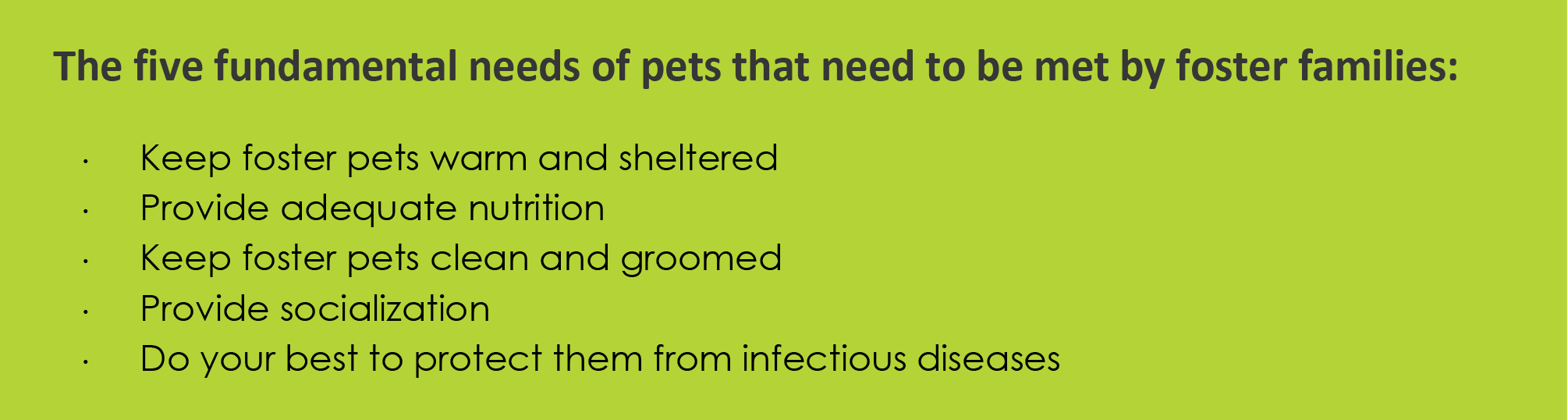 Foster pets should remain separated from resident pets for at least 14 days to prevent possible spread of disease. Moms, babies & neonates should always be separated.