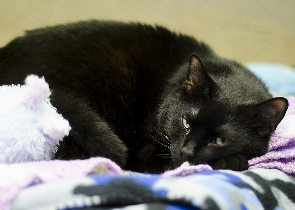 However, finding a home, even a temporary one, seemed impossible. Injecting insulin into an adult cat intimidated most people. George stayed with employees on weekends, but finally found his place as a permanent fixture in the upstairs offices of Lenawee Humane Society.