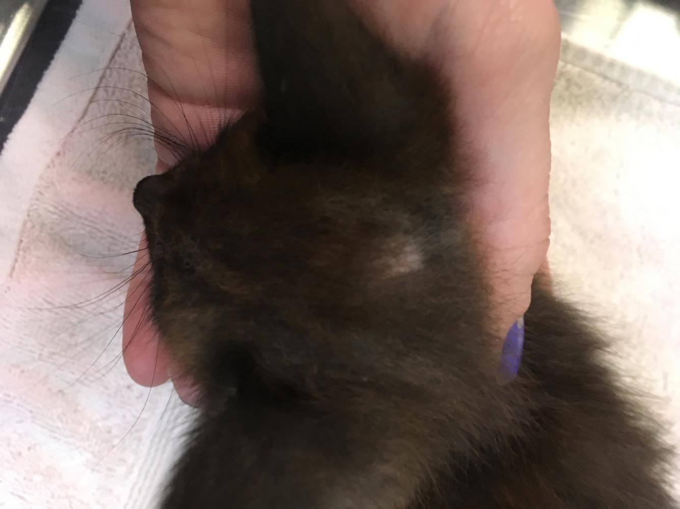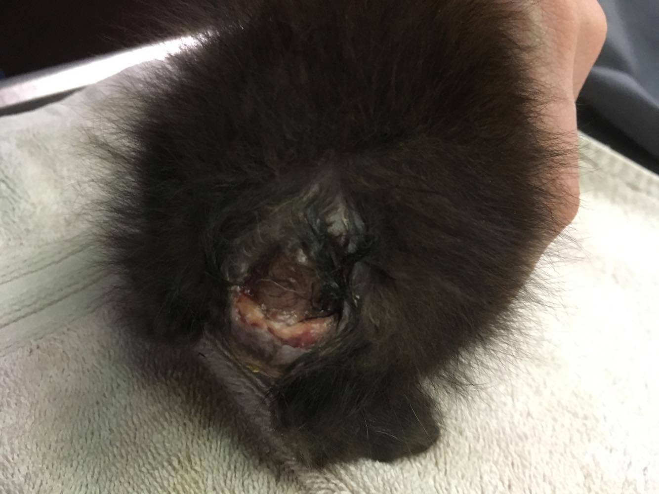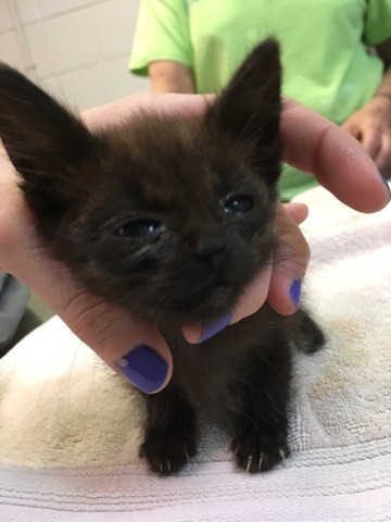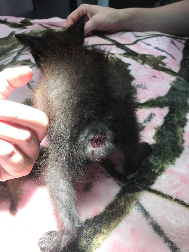 On July 14, 2017, a tiny black kitten was found near the highway, alone and severely injured. As our Hope Clinic team examined her, the amount of damage this kitten had endured was alarming. Her tail had been sheared completely off and she was covered in scrapes and other injuries, possibly by being tossed out of a moving car.